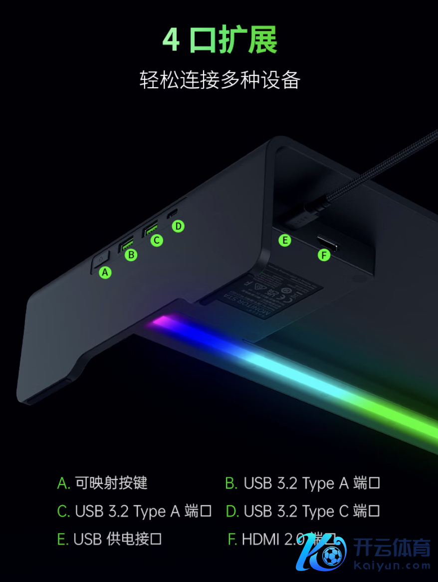 该增高架配备2个USB-A 3.2接口、1个 USB-C 3.2接口、1个 HDMI 2.0接口、1个 USB母口,增高架自己还配有一个可自界说按钮,撑合手在雷云App中自界说功能。