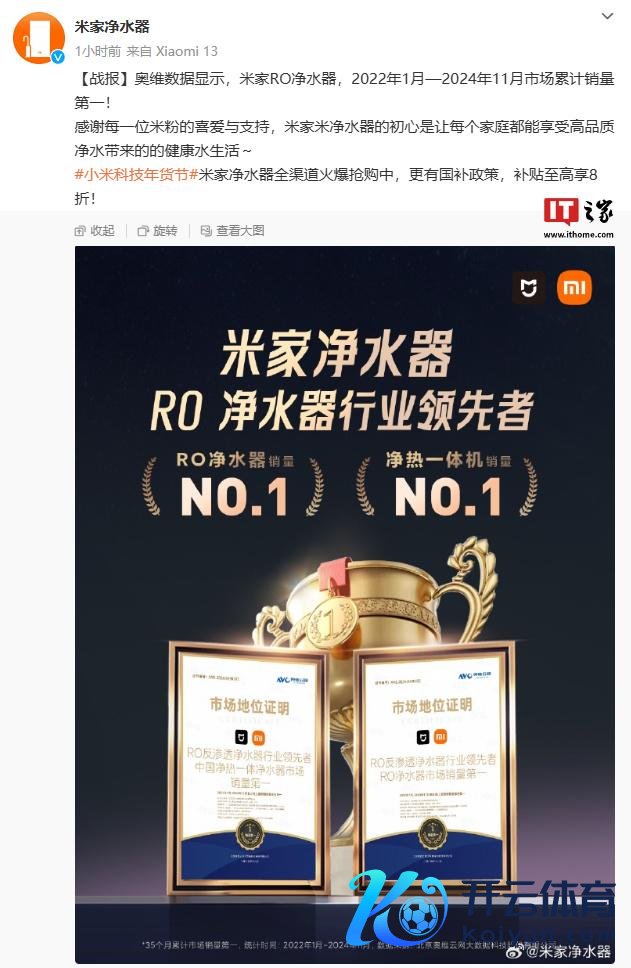 IT之家 1 月 14 日音书开云官网切尔西赞助商,据米家清水器微博音书,奥维数据表露,米家 RO 清水器 2022 年 1 月 - 2024 年 11 月市集累计销量第一。  海报表露,米家 RO 清水器销量 No.1、净热一体机销量 No.1。官方驻扎:35 个月累计市集销量第一,统计本事:2022 年 1 月-2024 年 11 月;数据着手:北京奥维云网大数据科技股份有限公司。 据IT之家此前报说念,小米本月开售有“米家清水器 N1 800G”和“小米米家富矿清水器”两款清水器居品,售价分辨为 1199 元和 3499 元。  ▲小米米家清水器 N1 800G  ▲小米米家富矿清水器