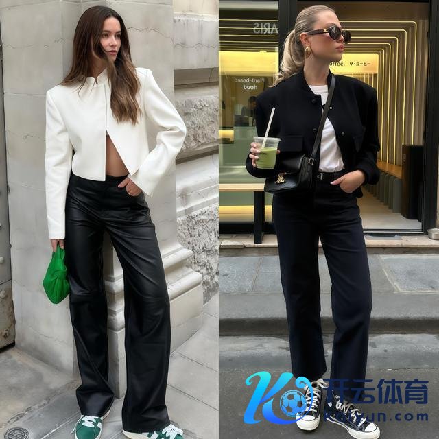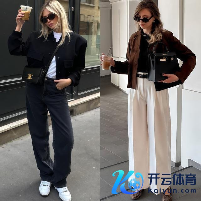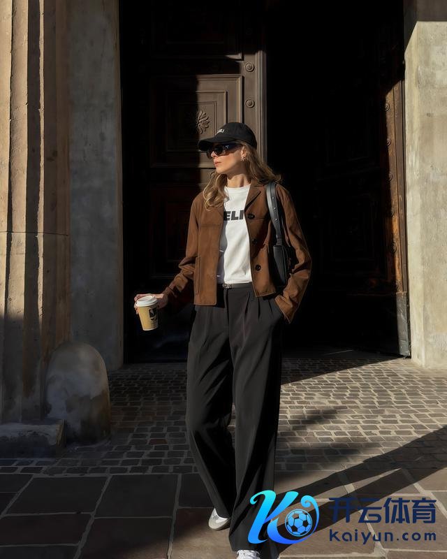 ▶ 玄色短夹克+奶白阔腿裤+阐述鞋,短长配最宽解 短长配遥远是最省事的组合,玄色短夹克上身、内搭白T、底下接一条奶白色阔腿裤,配色无谓纠结,闭眼搭皆不会出问题。 再加一顶棒球帽或者背一个神圣的包,搭配就很完竣了,这种穿法稳当赶时分但不思穿得太莽撞的清晨,几分钟就能料理外出。