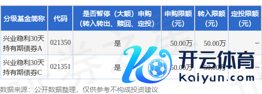 本站音讯,9月24日兴业基金解决有限公司发布《兴业稳利30天握有期债券型证券投资基金2025年国庆节前暂停大额申购(含救济转入和依期定额投资)公告》。公告中教导,为了保证基金的自若运作,保护现存基金份额握有东谈主利益,自2025年9月25日起兴业稳利30天握有期债券型证券投资基金2025年国庆节前暂停大额申购(含救济转入和依期定额投资),申购、救济转入上限金额为50.0万元开yun体育网,下属分级基金调理明细如下: